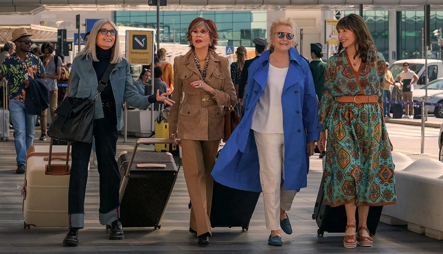 For the last five or six years, I’ve been engaging in what I call “Old Lady Movie Club” with a few girlfriends. The formation of this unofficial club started roughly around the time the first Book Club movie came out in 2018, which promised moviegoers of a “certain age” (+ enthusiastic gays) a boozy, over-the-top comedy starring some of Hollywood’s best loved but incomprehensibly under-employed actresses over the age of 60, including Jane Fonda, Mary Steenburgen, Candice Bergen, and yes, Diane Keaton. The film did so well at the box office, it became a franchise, spinning off another equally boozy, silly, vaseline-on-the-lens heavy sequel.