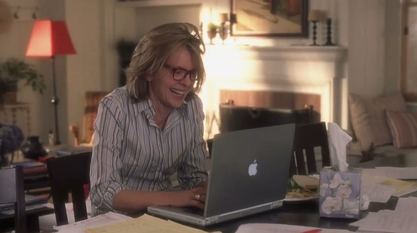 When Nancy Meyers re-teamed with Diane for her 2003 rom-com masterpiece, Something’s Gotta Give, much of the early press hype for the film was centered around a scene where the actress—then in her late 50s—does full-frontal nudity, startling Jack Nicholson’s playboy character who only has dated women significantly younger than him. Diane, free of her signature turtleneck, screams in that idiosyncratic way of hers before running offscreen. Jack’s character stumbles backwards and yells, “Oh GOD am I sorry!!!” It’s such a perfectly acted comedic moment that also tells us everything about how both men and the world at large view older women past their so-called “prime”: as scary, sexless beings.